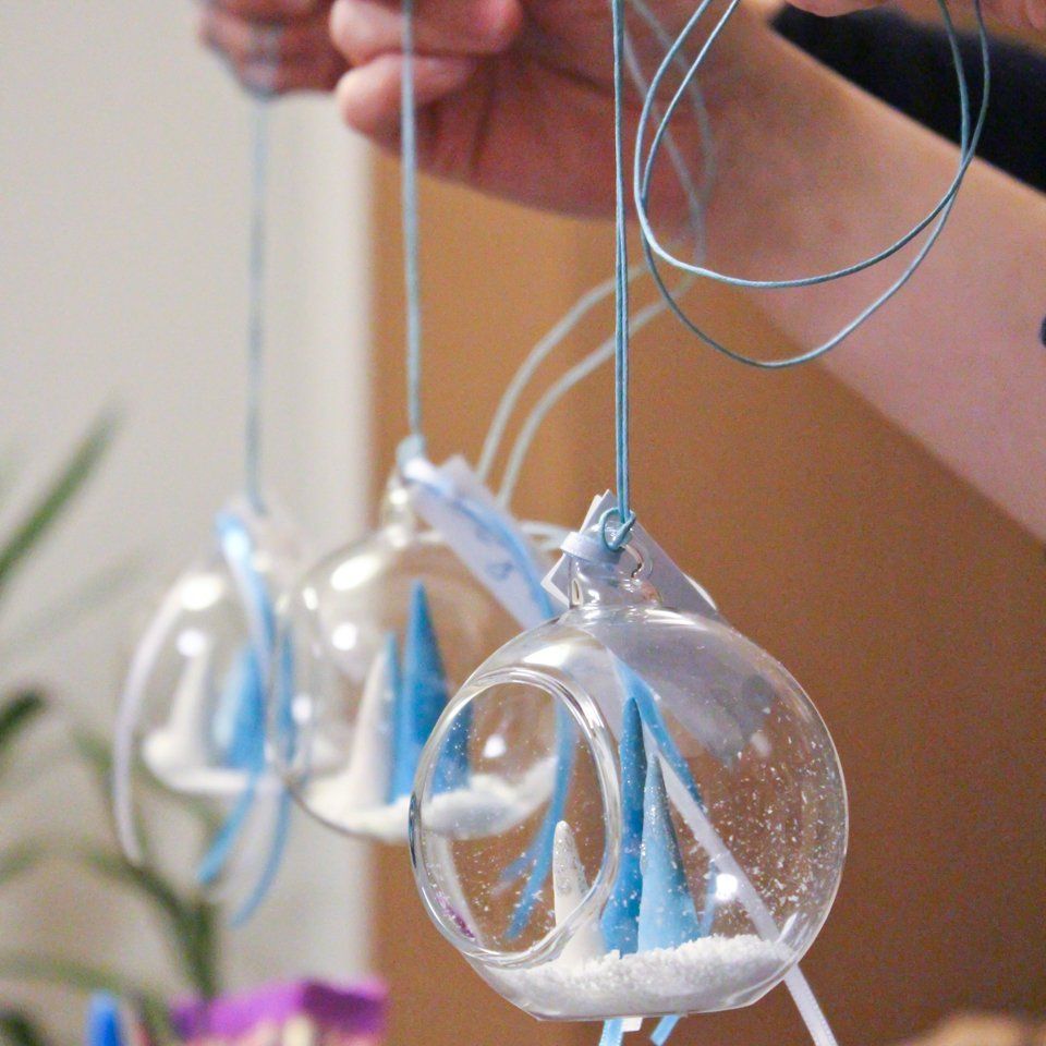 2xGlaskugeln, Fimo Kids türkis, Fimo Kids weiß, kleine Astscheiben, 60cm Band, 2m Schnur, Kunstschnee mit Glitzer, Leim, 2xPapieranhänger