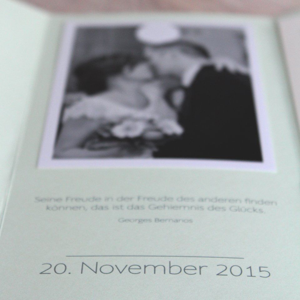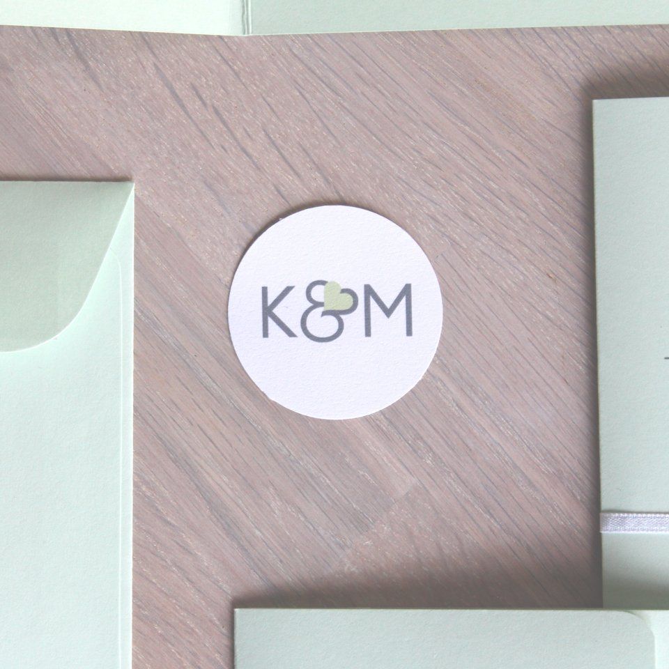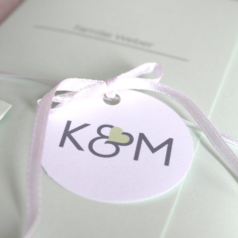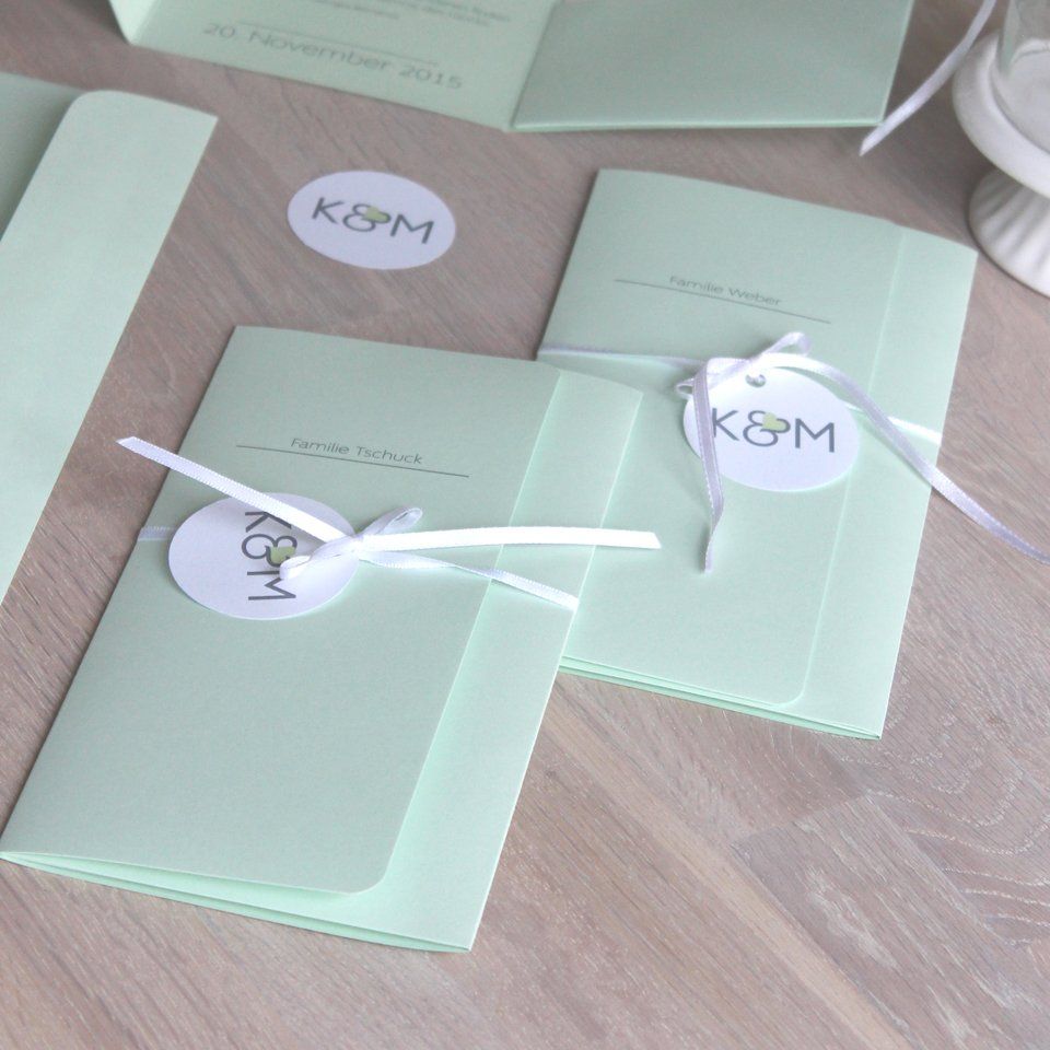 In einem verträumtem pastelligen Grün haben wir eine Einladung im Hochformat DIN lang geschnitten und gefaltet. Im Inneren hat die Einladung eine Einstecktasche für eine Karte mit allen wichtigen Informationen zur Hochzeit, die auch herausgenommen werden kann. Außerdem ist ein Foto des Hochzeitspaares zu sehen. Zusammengehalten wird die Einladung durch ein weißes schmales Seidenband, vorn zu einer kleinen Schleife gebunden. Die Initialen des Brautpaares (extra für Kristin und Marcel entworfen) finden auf einem runden Anhänger Platz. Ein rundes schlichtes Ganzes.