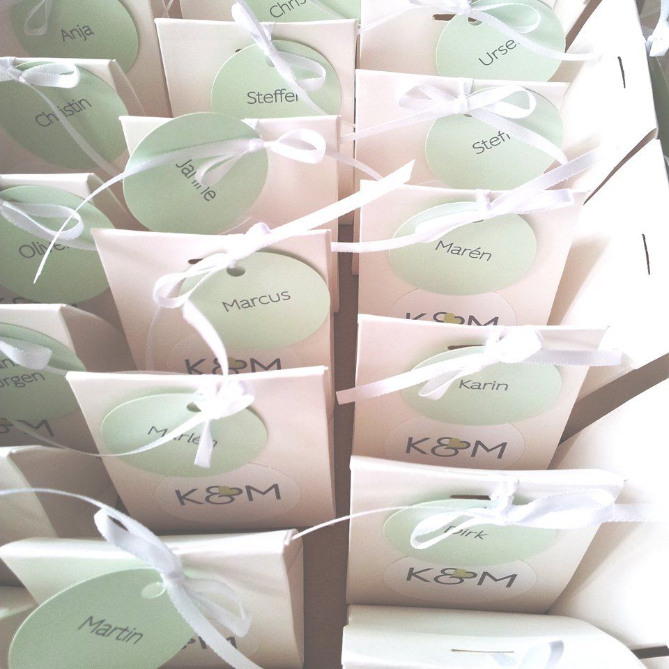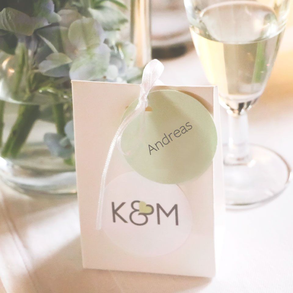 Passend zu den Einladungskarten durften wir die „Namenskärtchen“ liefern. Eine schöne schlichte weiße Box, die mit weißen Hochzeitsmandeln gefüllt ist, wird vom Namenskärtchen zum Gastgeschenk, das jeder mit nach Hause nehmen darf. Natürlich durften auch hier die Anfangsbuchstaben von Kristin und Marcel, das schlichte Grün und das Kreiselement nicht fehlen.