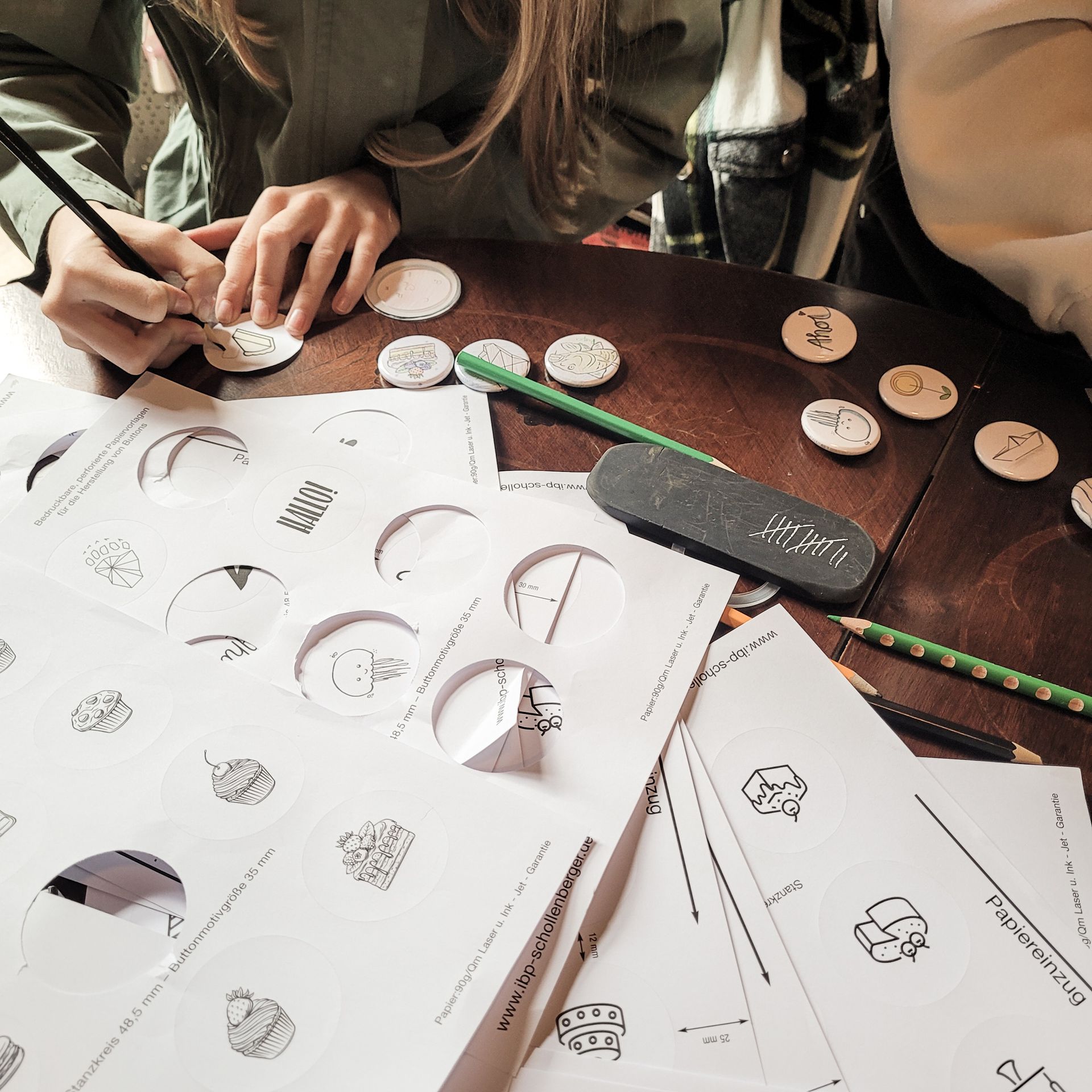 Zum Kennenlernen gab es selbst gestaltete und selbst zusammen gebaute Buttons für alle. In Pastelltönen oder kräftigen Farben, mit Motiv oder Spruch, so wie es jedem Einzelnen gefällt. Dann wurde es tierisch und wir bastelten hochbeinige Schäfchen mit filzigen Bäuchlein und einem freundlichen Lächeln