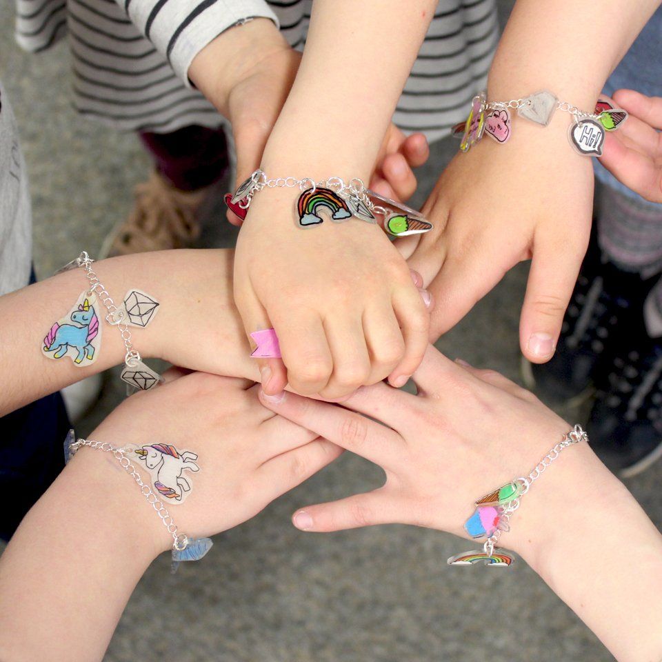 Gestern hatte ich 5 hübsche Mädchen da, die unter Anleitung Armbänder aus Kreativfolie gestalten haben. Aus Einhorn und Co. haben sie ihre Motive gewählt, abgepaust, ausgemalt und ausgeschnitten. Im Backofen ließen wir die Anhänger schrumpfen. Die Motive wurden kleiner aber dafür die Augen größer.