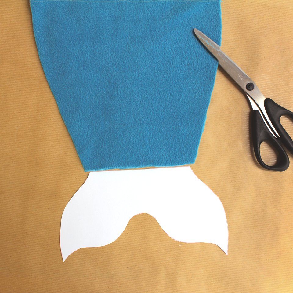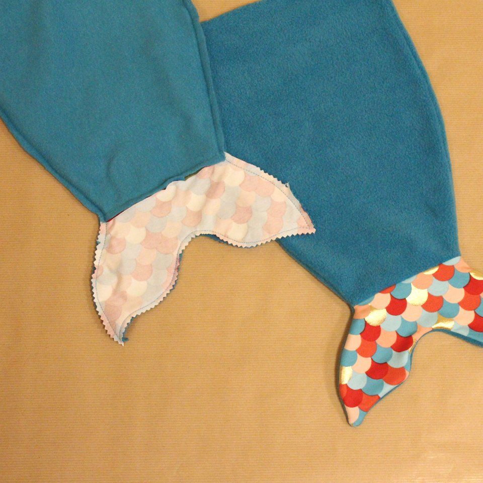 Nun könnt ihr loslegen und nähen. Zuerst näht ihr (rechts auf rechts) die Flosse an das vordere und hintere Mittelteil aus Fleece. Legt die beiden Teile aufeinander – die rechte Seite nach innen – und näht einmal um die komplette Flosse. Versäubert die Naht, wenn nötig, mit einer Zickzack-Schere. Dreht die Meerjungfrauenflosse auf links.