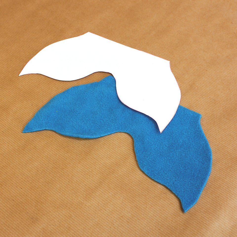 Schneidet das Mittelstück der Flosse aus Fleece zurecht, indem ihr die zwei Rechtecke nach unten hin schmaler werden lässt. Legt dazu die Flosse am unteren Ende an, nehmt die Nahtzugabe dazu und schneidet die Mittelstücke spindelförmig zu.