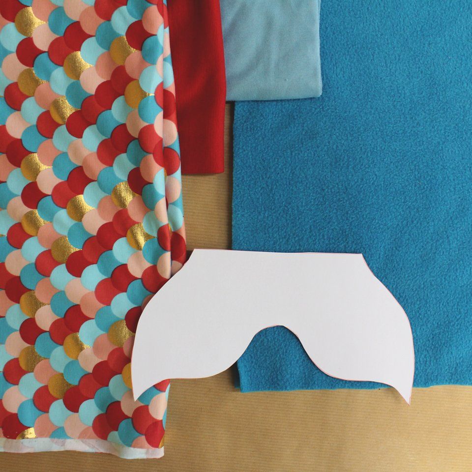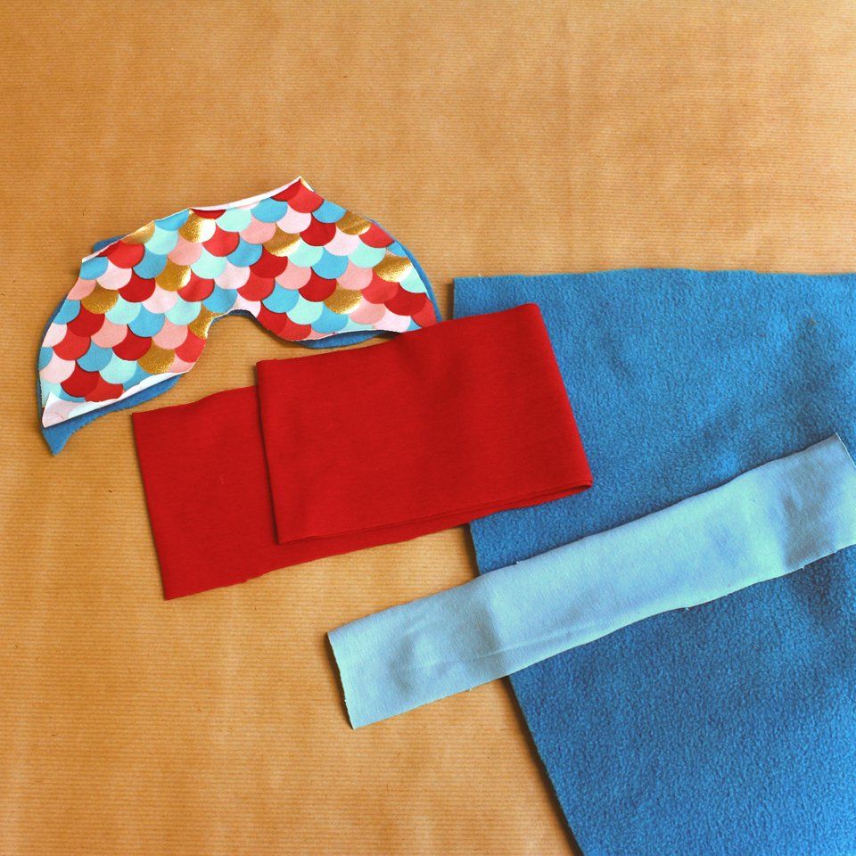 Danach schneidet ihr euch die Flosse zurecht. Einmal aus Fleece (hinten) und einmal aus dem Schuppen-Jersey (vorn). Beachtet dabei die Richtung der Schuppen und gebt Stoff für die Naht hinzu. Bündchen und Jersey sollten schon die richtigen Maße haben.