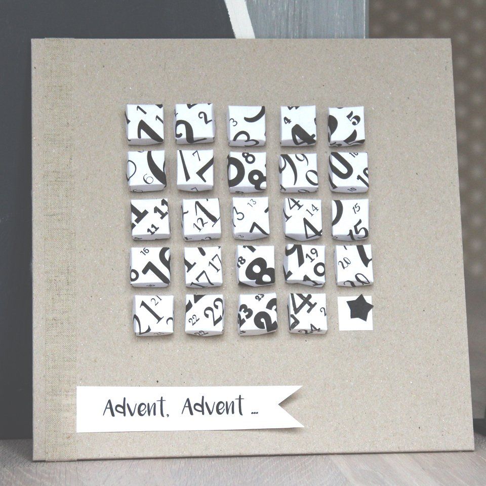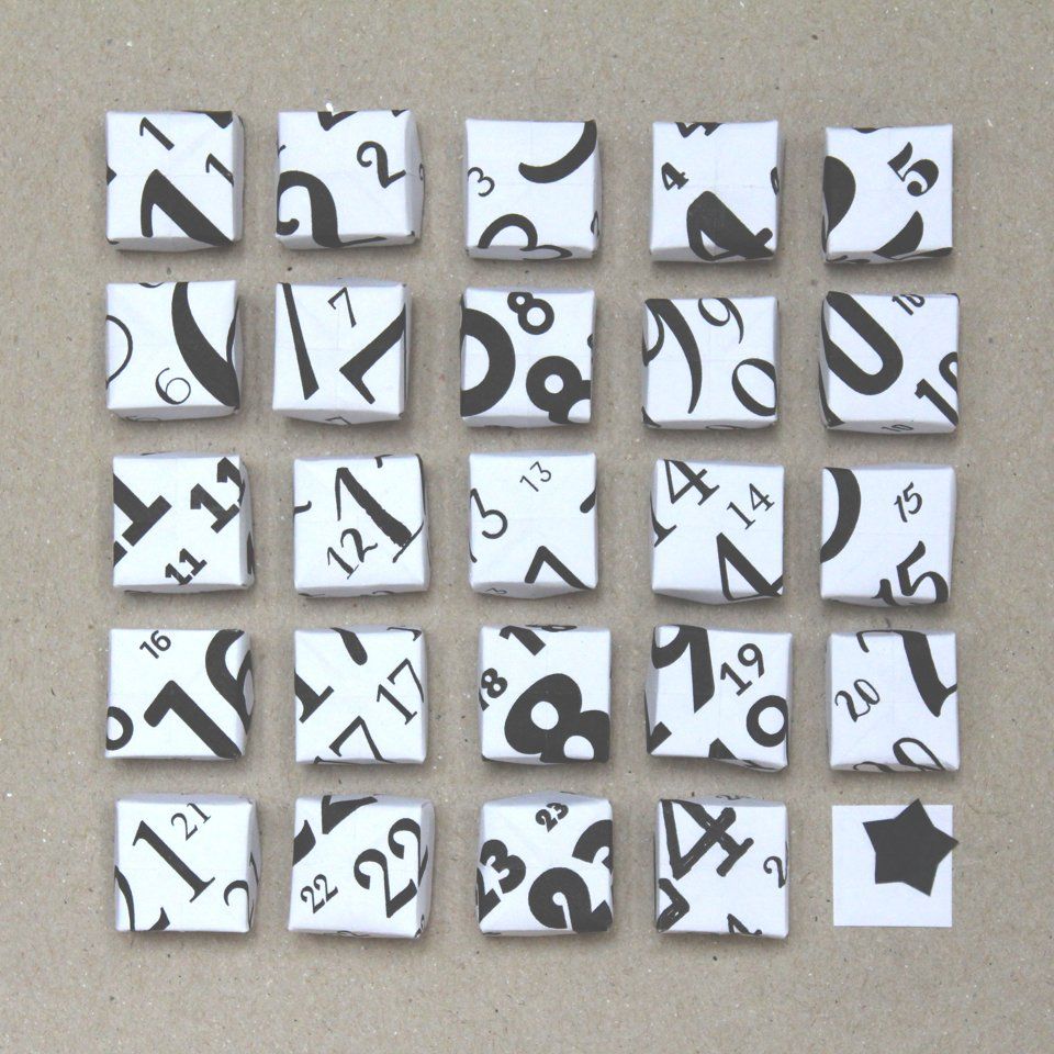 In dem Video sieht man, wie die kleinen Schächtelchen gefaltet werden. Sie bestehen jeweils aus zwei Hälften. Die eine aus dem 5x5cm großem und die andere aus dem kleineren Stück Papier. Das kleinere Papier ist die Schachtelhälfte, die auf die Graupappe geklebt und anschließend befüllt wird. Darauf kommt der Deckel. Sollte ein Schächtelchen mal nicht zusammen halten, kann man es innen mit Klebeband fixieren. Die Zahlen hatte ich mir schon vorher auf das Papier gedruckt. Alternativ kann man die Zahlen auch nach dem Falten auf den Deckel schreiben oder Sticker benutzen.
