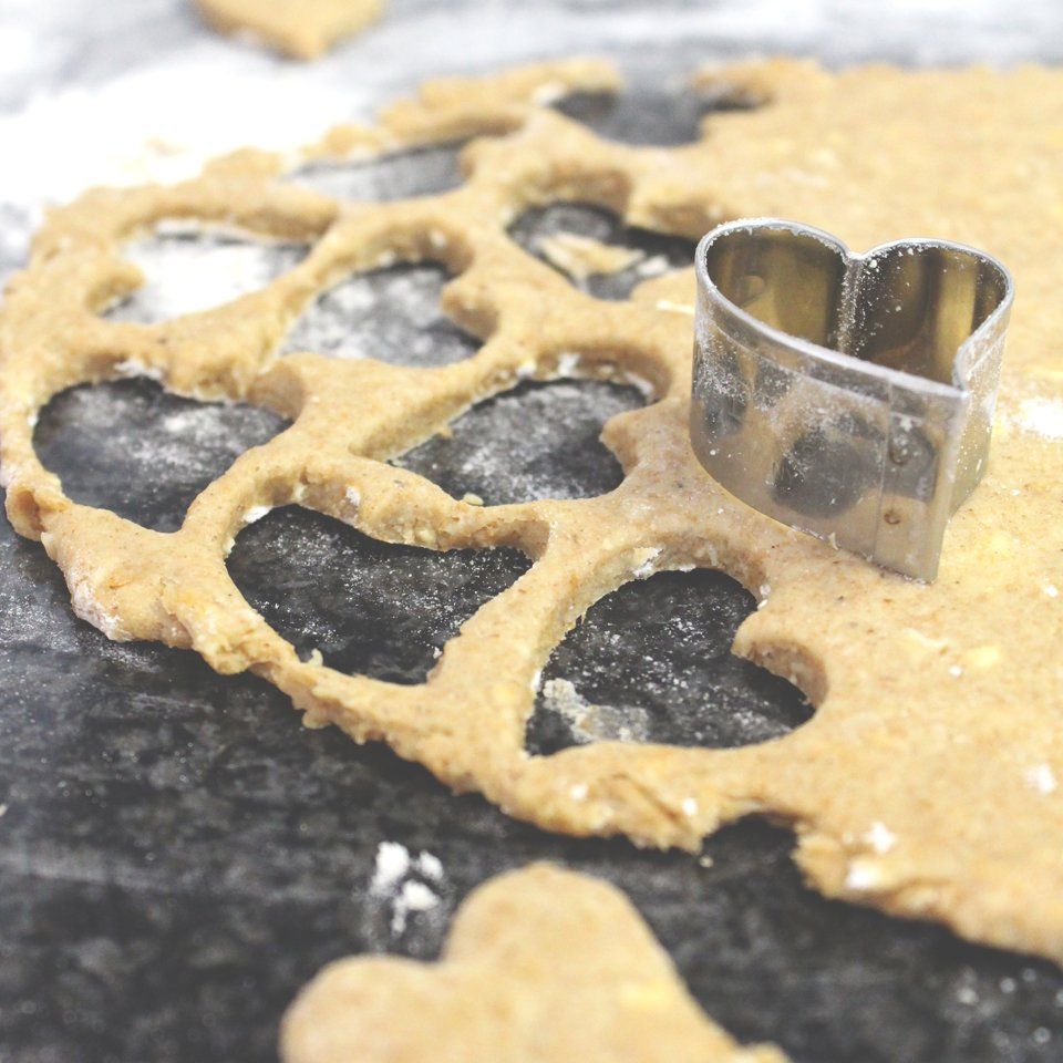 Den Teig nochmals gut durchkneten und ausrollen, ca. einen halben Zentimeter dick. Beim Ausrollen hilft Mehl, damit er nicht an der Arbeitsfläche oder am Nudelholz kleben bleibt. Mit einer Ausstechform Herzchen austechen. Wer Zeit hat kann diese Herzen gern noch einmal ein Stück gehen lassen.