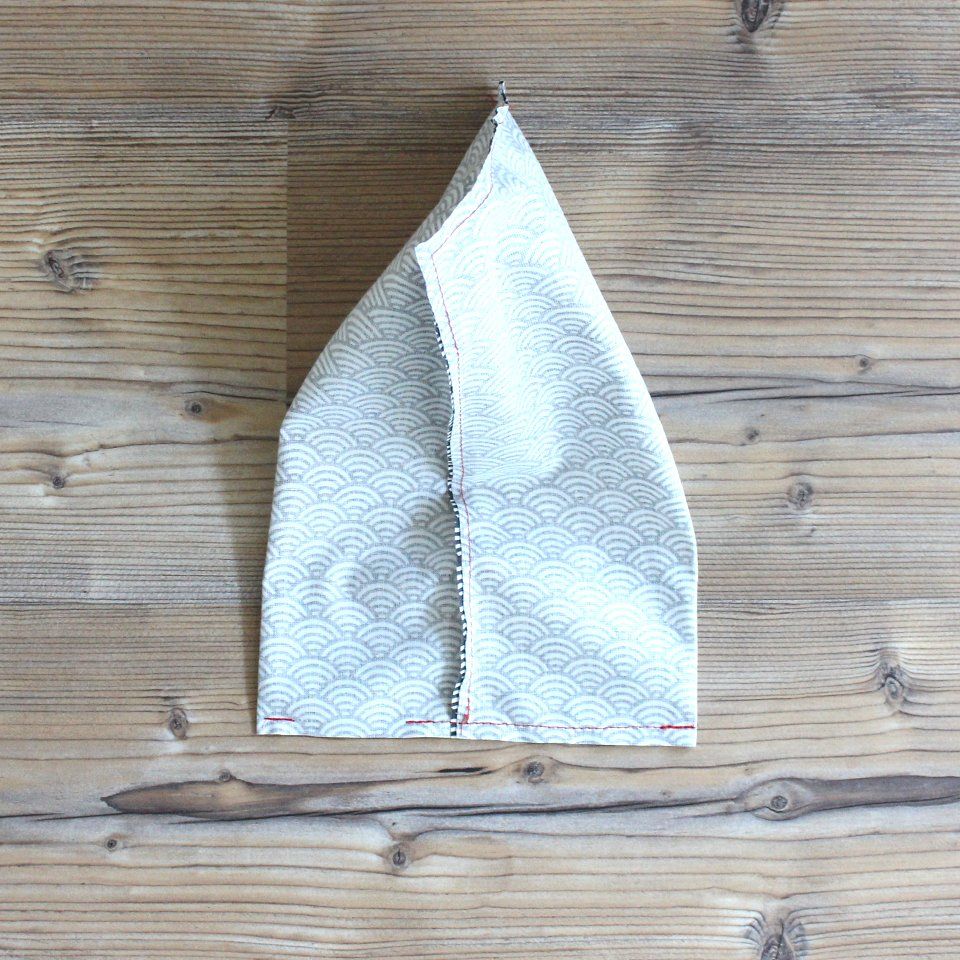 Dann legt an der zweiten kurzen, noch offenen Seite, das Ende der Naht der längeren Seite in die Mitte der kurzen Seite. Näht diese zu, bis auf ca. 10 cm und lasst es offen zum Wenden und Befüllen.