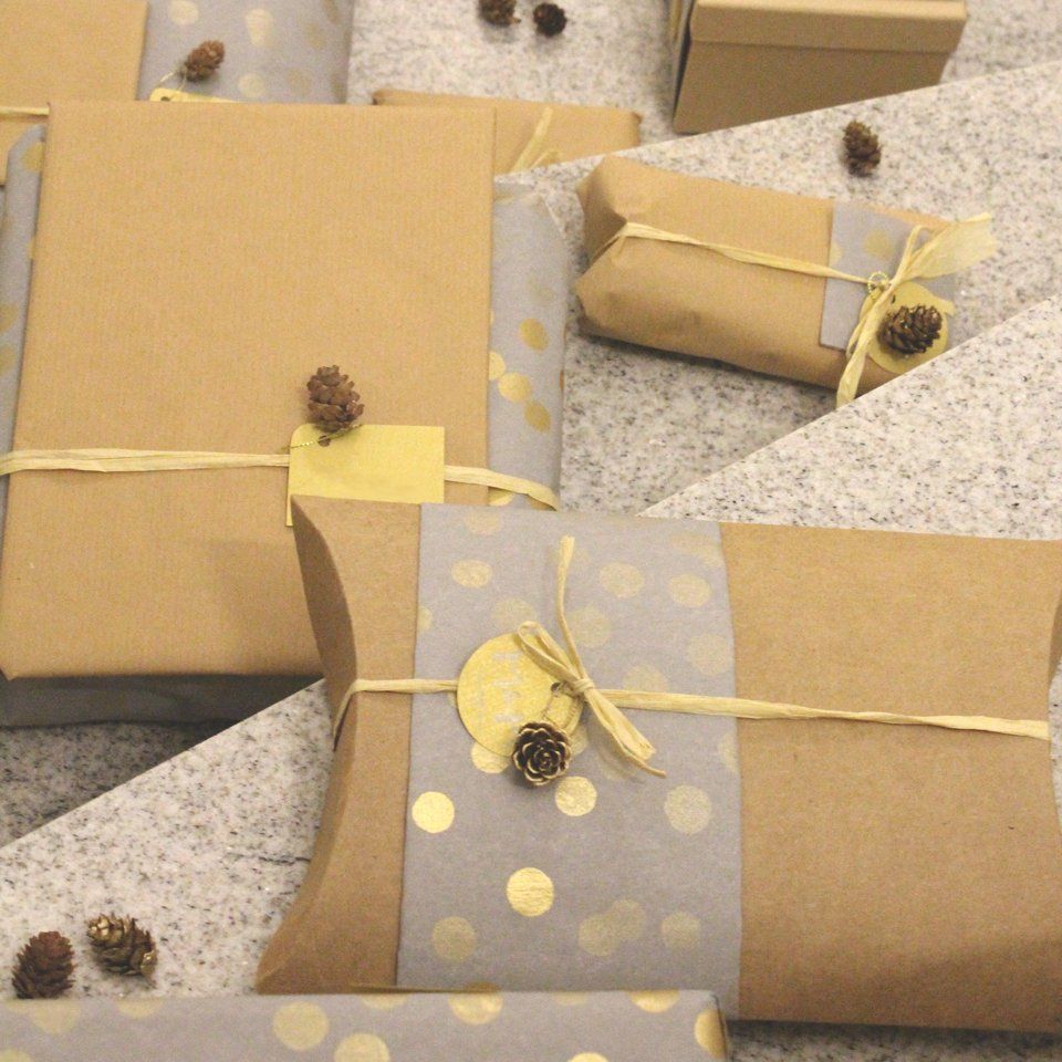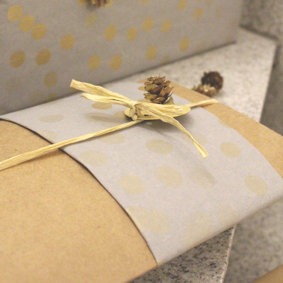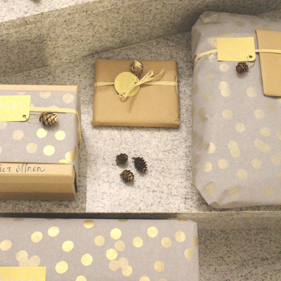 Und … Weihnachten 2017 habe ich wieder einfaches Kraftpapier verwendet. Diese Mal aber in Kombination mit Grau und Gold. Anfangs war ich skeptisch, ob diese Farben denn zusammen passen würden … aber sie passten perfekt zueinander. Das einfache Kraft- oder auch Packpapier harmoniert wunderbar mit den goldenen Punkten des grauen Geschenkpapieres. Mit kleinen Zapfen und goldenen Kreisen habe ich Abwechslung in die Geschenkeflut gebracht und jedes dadurch einzigartig gemacht.