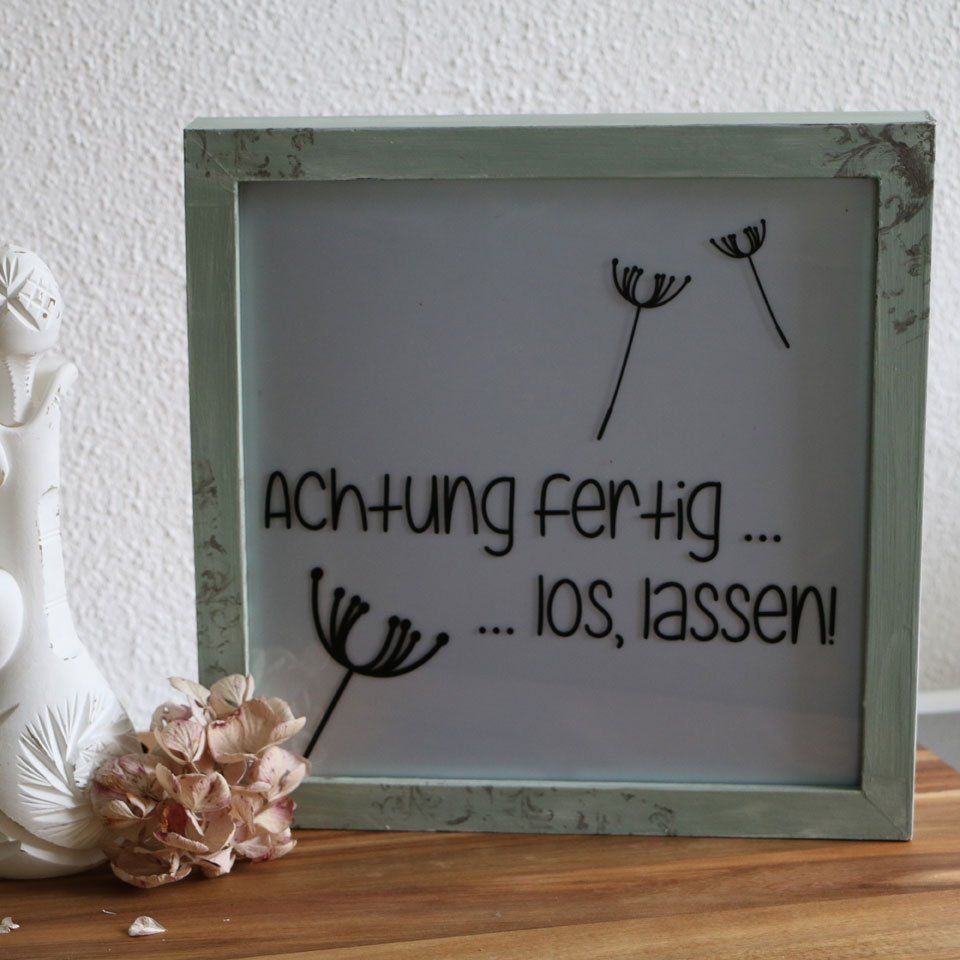 Die Vintage-Lichtbox hat folgende Maße (HxBxT): ca. 25,4cm x 25,4cm x 4,5cm und kann in zwei verschiedenen Chalky-Farben gestrichen werden. Hier stehen euch ein gemütliches Umber und ein wunderschönes helles Grün (wie unser Muster) zur Verfügung. Beleuchtet wird das ganze durch eine batteriebetriebene LED-Lichterkette. Der Spruch wird aus schwarzer Folie von uns vorbereitet und kann auch gern in einer anderen Anordnung angebracht werden. Ihr habt die Wahl: