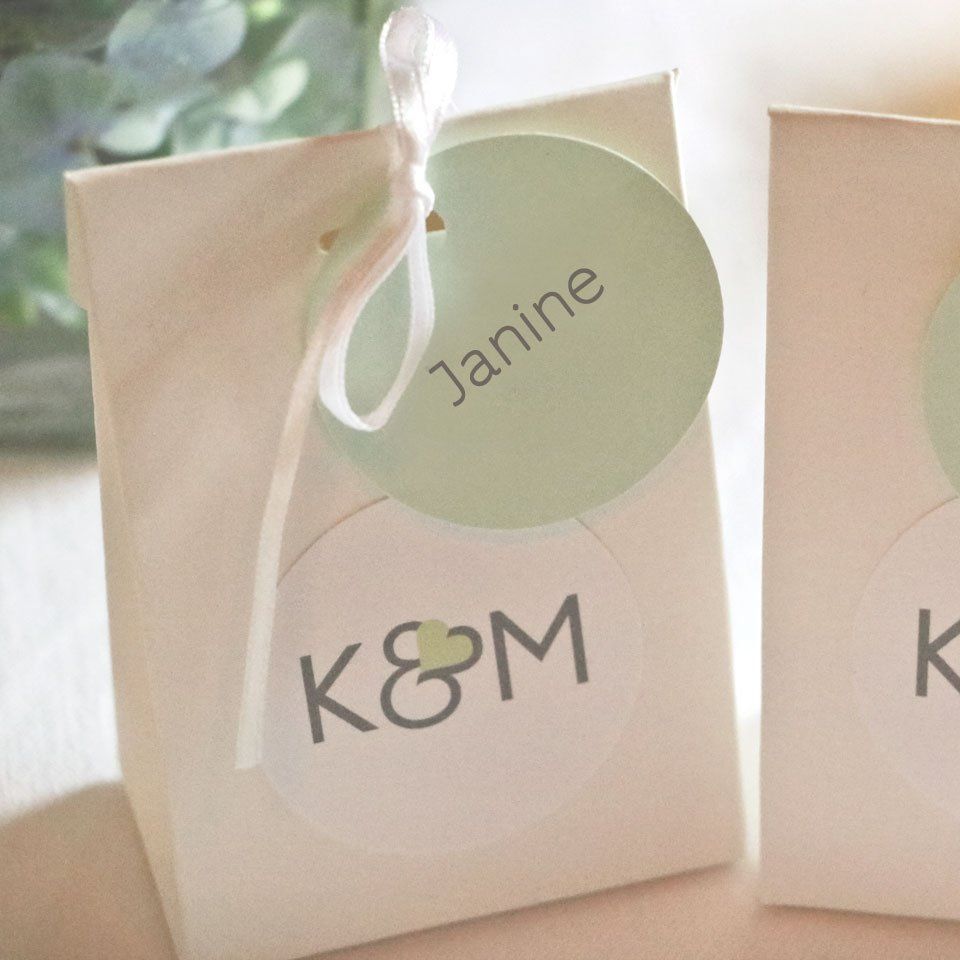 Passend zu den Einladungskarten durften wir die „Namenskärtchen“ liefern. Eine schöne schlichte weiße Box, die mit weißen Hochzeitsmandeln gefüllt ist, wird vom Namenskärtchen zum Gastgeschenk, das jeder mit nach Hause nehmen darf. Natürlich durften auch hier die Anfangsbuchstaben von Kristin und Marcel, das schlichte Grün und das Kreiselement nicht fehlen.