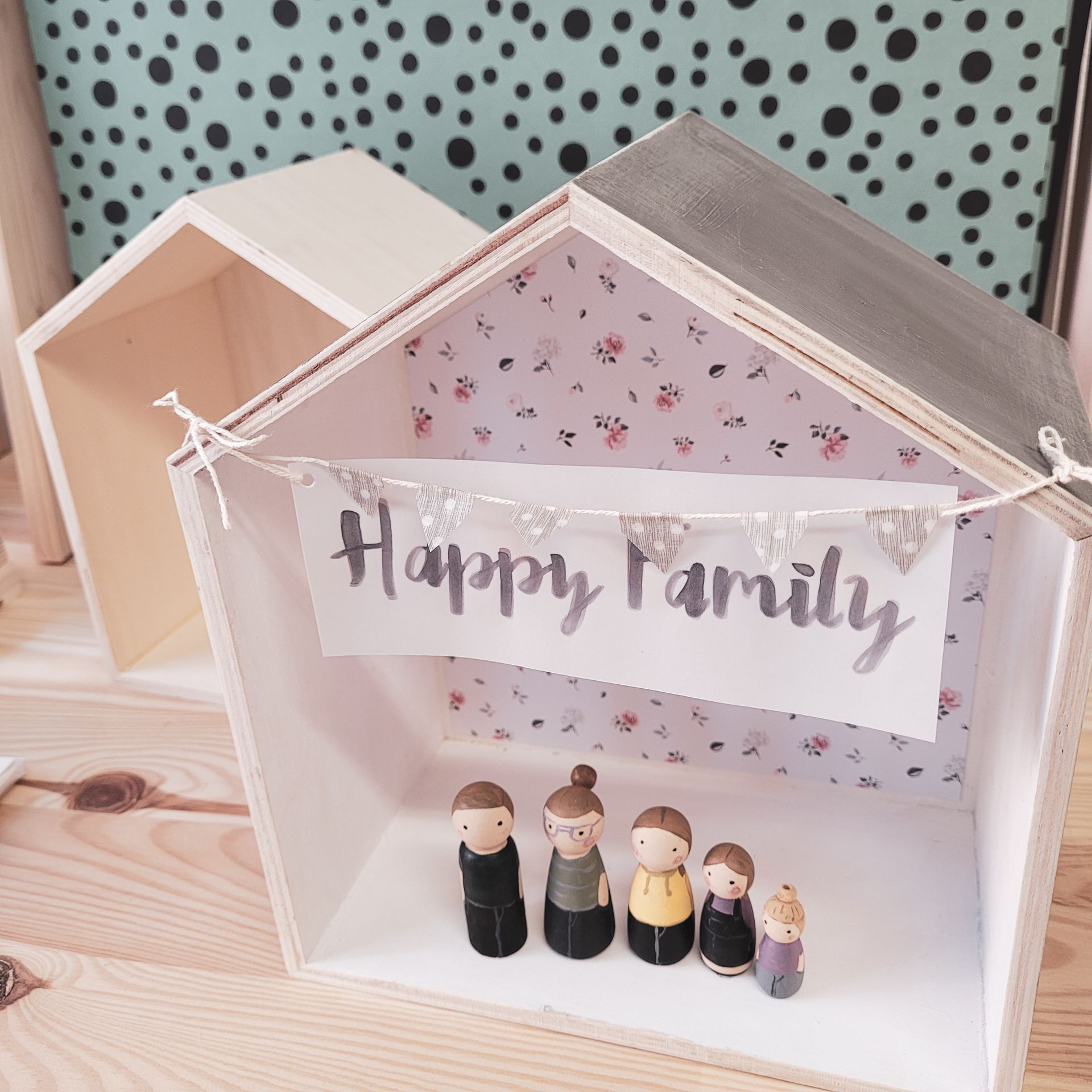 Schon nächste Woche, am 25.02.2023 gibt es die Möglichkeit in der Papeterie die eigene Familie als kleine Holzpüppchen abzubilden. In diesem Bastelkurs werden euch alle Arbeitsmaterialien zur Verfügung gestellt. Dazu gehören ein kleines oder ein großes Haus, 4 Holzpuppen (oder mehr), Papier, Farbe (Kreide- und Acrylfarbe), Schnur, eine Schriftvorlage für den eigenen Familiennamen oder "Happy Family". Jeder kann ganz individuell sein eigenes Häuschen gestalten und ich helfe euch dabei.